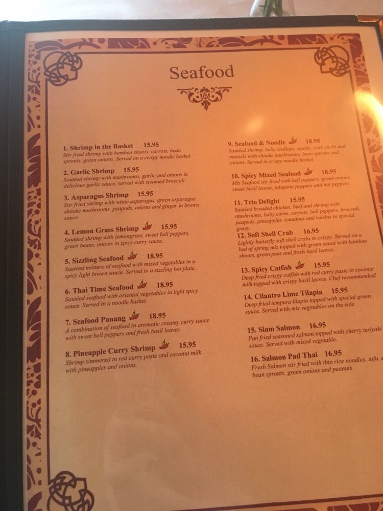 Deep fried crispy catfish with red curry paste in coconut milk with bell peppers, green bean and Thai eggplant, topped with crispy basil leaves; chef recommended!